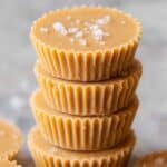 A close-up view of four stacked peanut butter cups, each with a smooth, light brown surface and ridged edges, showing a firm and slightly crumbly texture. The top peanut butter cup is sprinkled lightly with coarse salt crystals, adding a subtle contrast to the creamy brown color. The background is a soft white marbled texture, with a few small crumbs scattered around, enhancing the focus on the neat stack of these simple, sweet treats. Photo taken with an iphone --ar 4:5 --v 7