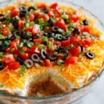 - Cheese and Toppings: Sprinkle the sharp shredded cheese as the next layer. Then scatter the black olives, diced tomatoes, and diced green onions evenly over the cheese.