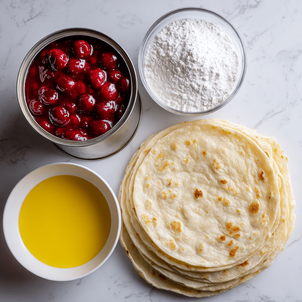 - Fill the tortillas: Spoon about 2 tablespoons of cherry pie filling evenly across the center of each tortilla. Be careful not to overfill to ensure tight rolling.