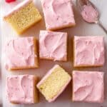 The image shows nine square pieces of yellow cake arranged closely on a sheet of white parchment paper over a white marbled surface. Each cake piece has one thick layer of smooth and creamy light pink frosting with subtle darker pink specks spread evenly on top. Two cake pieces are turned on their sides, revealing a soft and moist yellow interior with the pink frosting layer on top. One silver spoon with some frosting on it rests on the top right side, while two raspberries sit near the top left and bottom right corners. The overall look is clean and bright, highlighting the contrast between the yellow cake and pink frosting. photo taken with an iphone --ar 4:5 --v 7