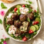 A white bowl filled with seven browned meatballs, some broken open to show a mixed green and beige inside, placed on a bed of dark green arugula leaves. Scattered around are fresh slices of bright green cucumber and red tomato chunks. Two dollops of creamy white sauce with red pepper flakes sit on top and beside the meatballs. The bowl is set on a white marbled surface with two pieces of flatbread at the top left and a crumpled white cloth napkin at the bottom right. A fork and knife with white handles rest at the top right. A small pink flower and green mint leaves are near the bottom left of the bowl. photo taken with an iphone --ar 4:5 --v 7