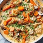 Blanquette de Dinde Automnale au Potiron et Marrons is a comforting French stew featuring tender turkey pieces simmered with seasonal pumpkin and chestnuts. This creamy, flavorful dish combines aromatic herbs, root vegetables, and a rich sauce made with cream and chicken broth, perfect for cozy autumn meals.