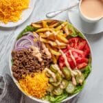 - Assemble the Bowl: Place the chopped romaine lettuce in a large serving bowl. Arrange the halved cherry tomatoes, sliced red onions, dill pickle chips, cooked ground beef, cooked french fries, and shredded sharp cheddar cheese around the edges of the lettuce for a colorful presentation.