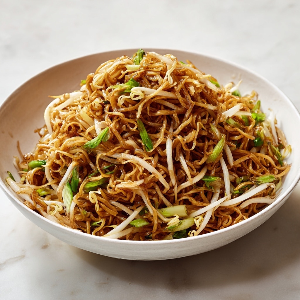 This authentic Cantonese Chow Mein recipe features perfectly pan-fried crispy noodles tossed with crunchy mung bean sprouts and fresh green onions, all coated in a savory blend of soy sauces and toasted sesame oil. Ideal for a quick and flavorful meal, this dish combines the satisfying textures of crispy and tender noodles with a balanced umami sauce.