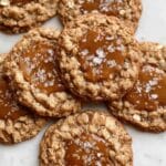 Delightfully chewy caramel oatmeal cookies featuring a buttery base, old-fashioned oats, and sweet toffee bits, encasing a gooey caramel center with a sprinkle of flaked sea salt on top for a perfect balance of sweet and salty flavors.