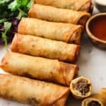 Store leftover cooked spring rolls in an airtight container in the refrigerator for up to 3 days. Reheat them in the oven or air fryer at 350°F for about 5 to 7 minutes to regain their crispiness. Do not microwave, as this can make the wrappers soggy.