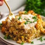- Step 7: Bake in the preheated oven for 30-35 minutes, until the stuffing is golden brown and the casserole is heated through.