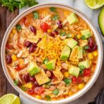 This flavorful Chicken Taco Soup is a hearty and comforting dish packed with shredded chicken, beans, corn, and a zesty blend of taco seasoning and lime juice. Perfect for a quick weeknight dinner, it simmers on the stovetop and is served with a variety of fresh toppings like shredded cheese, pico de gallo, avocado, and sour cream to customize your bowl.