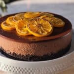 Decadent chocolate orange cheesecake combining rich chocolate and bright citrus flavors with a smooth, creamy texture on a crunchy chocolate cookie crust, topped with a luscious dark chocolate ganache and fresh orange slices.