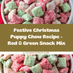Keywords: Puppy Chow, Muddy Buddies, Christmas snack, festive treat, holiday recipe, Chex mix dessert, candy coated cereal