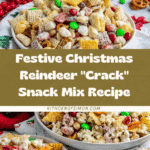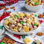 This festive Christmas Reindeer “Crack” snack mix combines crunchy Bugles, mini pretzels, Rice Chex cereal, dry roasted peanuts, and colorful red and green M&M’s all coated in smooth melted white chocolate. It’s a perfect sweet and salty treat to share during the holidays or for gifting.