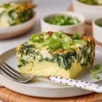 A thick square slice of layered spinach and cheese egg casserole sits on a white plate placed on a wooden board. The bottom layer is a smooth, light yellow egg base, topped by a middle layer filled with green, leafy spinach mixed with white cheese bits, giving a textured and slightly creamy look. The top layer is golden brown and lightly crisped cheese with some browned spinach pieces, garnished with thin rings of green onion scattered on top. A fork with a white handle and dark dots lies next to the casserole piece. In the background, blurred white bowls with green ingredients rest on a white marbled surface. Photo taken with an iphone --ar 4:5 --v 7