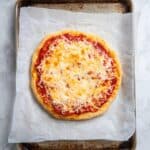 A small pizza sits on a piece of white parchment paper placed on a rusty metal baking tray. The pizza has a golden-brown thick crust, topped with a bright red tomato sauce spread evenly underneath a layer of melted white cheese that covers most of the surface with some red peeking through. The baking tray rests on a white marbled textured surface, creating a clean contrast to the aged tray and the vibrant pizza. photo taken with an iphone --ar 4:5 --v 7