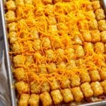- Step 6: Place the remaining tater tots in a layer over the meat mixture and sprinkle the remaining shredded cheddar cheese on top.