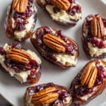 Delightfully sweet and creamy, these Cranberry Pecan Cream Cheese Stuffed Dates are the perfect bite-sized appetizer or snack. Soft Medjool dates are filled with a luscious blend of cream cheese, dried cranberries, and pecans, lightly sweetened with honey and infused with vanilla. Baked until warm and slightly softened, they make an elegant addition to any gathering or a special treat anytime.