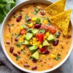 - Serve and Garnish: Ladle the warm soup into bowls. Top with your choice of crushed tortilla chips, sliced avocado, sour cream, diced jalapeños, chopped red onion, shredded cheddar, and fresh cilantro for added flavor and texture.
