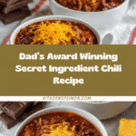 This hearty and flavorful chili recipe, Dad’s Award Winning Secret Ingredient Chili, combines ground beef with a blend of beans, tomatoes, chili seasoning, and unique additions like semi-sweet chocolate and coffee grounds for a rich depth of flavor. Slow simmered for three hours, this chili is perfect for a comforting meal that delivers warmth and complex taste.