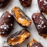 Store the Date Snickers in an airtight container in the refrigerator for up to 5 days. If you prefer, you can freeze them for up to a month and thaw in the fridge before eating. To enjoy them softer, allow them to come to room temperature for 10 minutes after taking them out of the fridge.