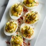 Classic deviled eggs elevated with a creamy filling of mayonnaise, cream cheese, Dijon mustard, and a splash of olive brine and vodka, garnished elegantly with green olives and a sprinkle of paprika for a perfect appetizer or party snack.