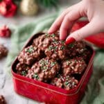A festive red square tin filled with clusters of milk chocolate-covered treats, each piece topped with small round red, green, and white sprinkles. The chocolate clusters are textured with visible nuts or other bits inside, creating an uneven, bumpy surface. A woman's hand with red nail polish is reaching into the tin, gently picking up one of the clusters. The tin sits on a white marbled surface with a soft green cloth nearby and blurred festive decorations in the background. photo taken with an iphone --ar 4:5 --v 7