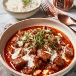 - Season and Serve: After simmering, taste the curry and adjust the seasoning with fish sauce and palm sugar as needed, adding a little at a time until the balance of salty and sweet suits your preference. Transfer the curry to a serving plate, drizzle with coconut cream, and garnish generously with finely sliced makrut lime leaves and fresh red chili slices for added fragrance and heat.