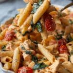 This Feta Pasta & Chicken Bake is a deliciously creamy and flavorful one-pan meal combining tender marinated chicken, roasted cherry tomatoes, feta and Boursin cheeses, sun-dried tomatoes, and perfectly cooked penne pasta. The dish is baked until bubbly and golden, then tossed with fresh basil for a fragrant finish. It’s an easy-to-make, crowd-pleasing dinner perfect for weeknights or entertaining.