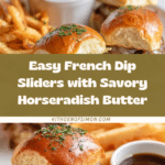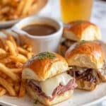 Keywords: French Dip Sliders, roast beef sliders, horseradish mayo sliders, King’s Hawaiian rolls, beef jus, slider recipe, party appetizer