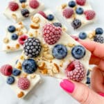 A triangular piece of frozen white yogurt bark is held by a woman's hand with pink nail polish, showing scattered whole blueberries and raspberries embedded within the creamy white layer, along with small bits of chopped nuts dispersed evenly throughout; in the background, more pieces of the yogurt bark rest on a white marbled surface, displaying the same colorful combination of frozen berries and nuts. photo taken with an iphone --ar 4:5 --v 7