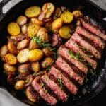 A black skillet filled with two main parts: on the left, a pile of roasted baby potatoes cut into halves and quarters, showing a crispy golden-brown outside and soft yellow inside; on the right, several slices of medium-rare steak arranged in a neat row, with a pink center and a browned outer edge. A few green sprigs of fresh herbs lay across the steak. The skillet sits on a white marbled surface. photo taken with an iphone --ar 4:5 --v 7