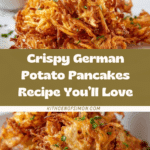 Deliciously crispy German Potato Pancakes made from shredded gold potatoes mixed with eggs, flour, onions, and seasonings, pan-fried to golden perfection. These savory pancakes are a perfect side dish or breakfast option, offering a delightful crunch and comforting homestyle flavors.