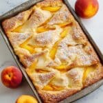 A rectangular metal baking tray filled with a fresh peach cobbler that has a golden-brown crust lightly dusted with powdered sugar. The top crust is uneven with large triangular and square sections folded in ways that reveal warm yellow peach slices underneath, bubbling softly through the gaps. Around the tray, there are three fresh peaches placed on a white marbled surface, adding a pop of bright red and orange color. The cobbler looks warm and inviting with a soft texture, showing some crisp edges around the crust. photo taken with an iphone --ar 4:5 --v 7