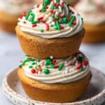 Delight in the festive flavors of Gingerbread Cheesecake Cookies, a perfect holiday treat combining spicy gingerbread cookie cups filled with creamy cinnamon-vanilla cheesecake frosting and topped with colorful sprinkles. These delightful bites blend the warmth of ginger, cinnamon, and molasses with a luscious cheesecake filling, baked to perfection in muffin pans for a fun presentation.