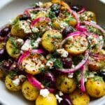 This Greek Potato Salad recipe offers a vibrant, tangy, and bold flavor without using mayonnaise. Featuring tender petite potatoes, briny kalamata olives, sun-dried tomatoes, capers, fresh dill, and crumbled feta, all tossed in a zesty red wine vinegar and olive oil dressing. Perfect as a refreshing side dish for Mediterranean-inspired meals or as a light, flavorful salad on its own.