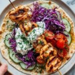 This Grilled Chicken Flatbread Wrap features tender grilled chicken skewers paired with fresh, crisp veggies like cucumber, cherry tomatoes, and red cabbage. Topped with a tangy yogurt sauce infused with lemon and olive oil, it’s a flavorful, light, and satisfying meal perfect for lunch or dinner.