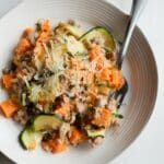 A hearty and flavorful Ground Turkey Sweet Potato Bake featuring tender roasted sweet potatoes, sautéed ground turkey, and fresh zucchini, all topped with melted parmesan cheese for a comforting and nutritious meal.
