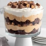 Keywords: fudge brownie trifle, peanut butter pudding dessert, layered dessert, Reese’s peanut butter cups, no-bake pudding trifle