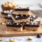 The image shows a stack of square bars on a light wooden board against a white marbled background. Each bar has two layers: the bottom layer is a crumbly light beige cookie base with visible nut pieces, and the top layer is smooth, glossy dark chocolate. Chopped white nuts are sprinkled all over the chocolate layer, adding texture and contrast. Some bars are stacked leaning on each other, and whole nuts and a dark chocolate chip are scattered around the board for decoration, with a blurred bowl of nuts in the back. photo taken with an iphone --ar 4:5 --v 7