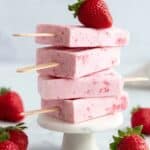 The image shows a stack of four pink strawberry popsicles, each with visible small red fruit pieces inside, held together on wooden sticks. The popsicles are arranged in a slightly tilted pile on a small white pedestal plate, with a ripe strawberry placed on top of the uppermost popsicle as garnish. Around the base of the pedestal plate, there are several fresh strawberries with green leaves, scattered on a white marbled surface. The background is softly blurred, emphasizing the popsicles and strawberries in the foreground. Photo taken with an iphone --ar 4:5 --v 7