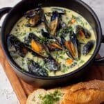 Store any leftover mussels and sauce in an airtight container in the refrigerator for up to 2 days. Reheat gently on the stovetop over low heat to avoid overcooking the mussels. Avoid reheating in a microwave as it may dry them out.