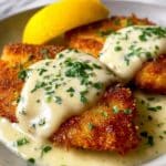 This Lemon Pecorino Crusted Chicken features tender chicken breasts coated in a zesty pecorino and lemon breadcrumb crust, pan-fried to golden perfection and served with a rich and creamy lemon sauce. The sauce’s tangy lemon flavor and savory pecorino cheese complement the crunchy crust, creating a delightful and sophisticated dish perfect for a comforting dinner.