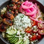 - Add toppings: Top the grain base with sliced grilled chicken, pickled red onions, halved cherry tomatoes, cucumber slices, and crumbled feta cheese.
