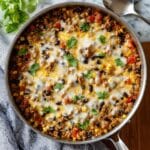 Keywords: Mexican beef skillet, beef and rice skillet, one-pan Mexican dinner, easy Mexican recipe, ground beef and rice
