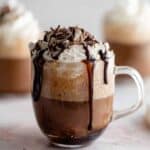 A clear glass mug contains a three-layer drink on a white marbled surface; the bottom layer is dark brown, the middle layer is a lighter creamy brown with frothy bubbles, and the top layer is a thick swirl of white whipped cream. Rich dark chocolate syrup drips down from the whipped cream, with some chocolate shavings scattered on top and a few pieces around the base of the mug. The glass handle is visible on the right side, and blurred similar drinks appear in the soft background. photo taken with an iphone --ar 4:5 --v 7