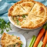 Store leftover pot pie in an airtight container in the refrigerator for up to 3 days. To reheat, warm slices in the oven at 350℉ (175℃) for 15 to 20 minutes until heated through to maintain the crust’s crispness. You can also freeze the unbaked pie for up to 2 months; bake from frozen, adding 10–15 minutes to the baking time.