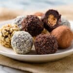 A white plate holds a mix of eight round dessert balls arranged close together, each with different coatings. Two balls near the front are coated with small chopped nuts, creating a rough, beige and light brown texture. Next to them, two balls have a dark brown crumbly coating, looking like cocoa powder or crushed cookies. Behind these, there are three more balls with varied coatings: one covered in a white powdery layer with dark specks, another with a light brown cocoa-like dust, and one with a smooth, slightly shiny, dark chocolate surface with a cut edge showing a creamy filling inside. The plate sits on a light brown textured cloth, and the background is a soft white marbled surface. Photo taken with an iphone --ar 4:5 --v 7