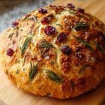 This No-Knead Rosemary Cranberry Bread is a rustic, flavorful loaf infused with fresh rosemary and tart dried cranberries. Made with simple ingredients and a hands-off preparation, it requires no kneading and utilizes slow fermentation for a chewy texture and complex taste. Baked in a preheated Dutch oven, the bread develops a golden crust with a tender crumb, enhanced by a finishing drizzle of olive oil and sea salt.