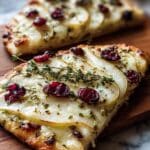This Pear, Brie, and Cranberry Flatbread with Thyme is a delightful combination of sweet, savory, and tart flavors. Featuring a crisp flatbread base topped with ripe pear slices, creamy melted brie, whole-berry cranberry sauce, fragrant fresh thyme, and toasted nuts, this easy-to-make appetizer or light meal balances textures and tastes perfectly. Finished with a drizzle of honey and a pinch of sea salt and cracked black pepper, it’s an elegant and crowd-pleasing dish perfect for entertaining or a cozy night in.