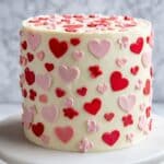 A tall, round cake covered in smooth, creamy white frosting is decorated with many small heart shapes in shades of red, pink, and light pink. These hearts vary in size and are evenly spread across the sides and top of the cake, creating a charming and playful pattern. The cake sits on a simple white cake stand against a white marbled textured surface. photo taken with an iphone --ar 4:5 --v 7