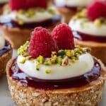These Raspberry & White Chocolate Tartlets offer a delightful balance of sweet and tart flavors with a crisp buttery crust, luscious raspberry jam, and a creamy white chocolate filling, topped with crunchy pistachios and fresh raspberries for a sophisticated dessert perfect for any occasion.