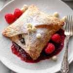 - Serve: Dust the pastries lightly with additional confectioners’ sugar. Serve them warm or at room temperature with the raspberry sauce drizzled on top or on the side, garnishing optionally with fresh raspberries and extra chocolate chips for an elegant presentation.
